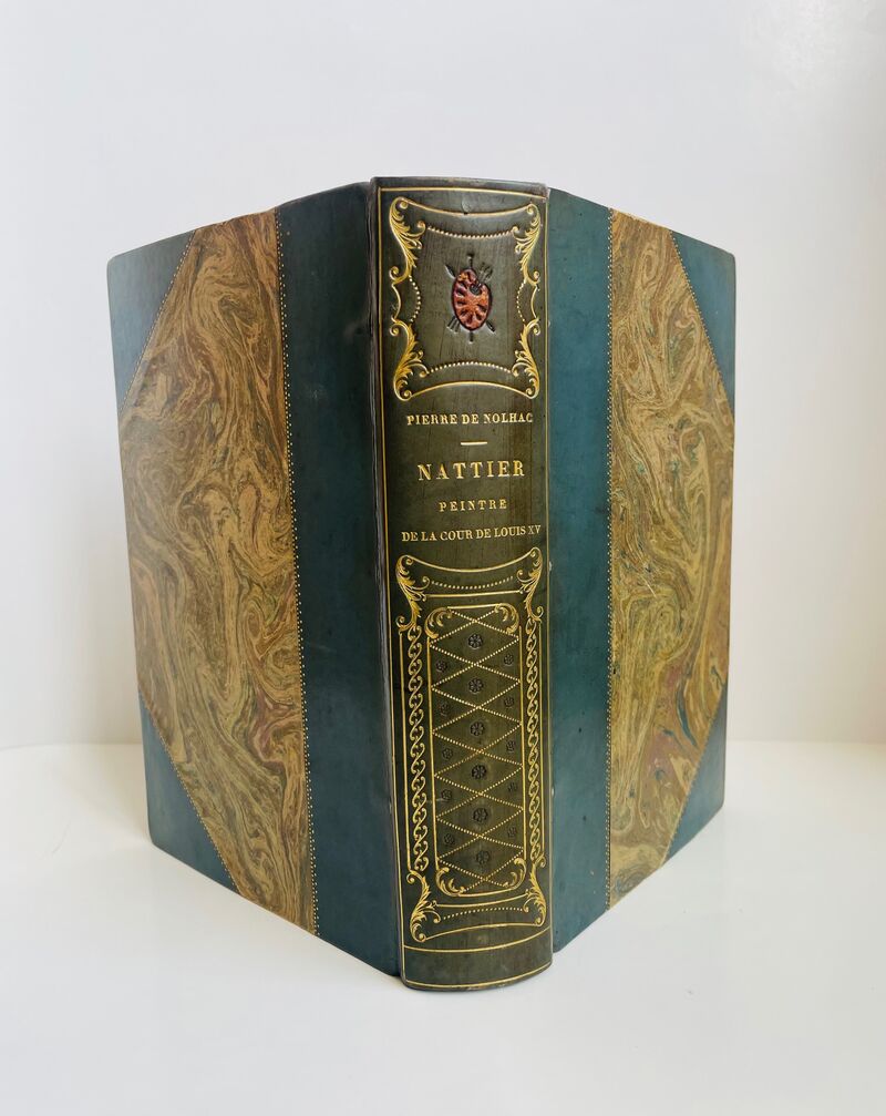 Reliure demi-maroquin bleu à coins. Dos lisse finement orné de filets et de fleurons dorés. Pointillés dorés bordant les plats et petite palette de peinture mosaiquée. Gardes marbrées. Tête dorée. Couverture et dos conservés. Intérieur avec quelques rousseurs. Illustré de nombreux portraits contrecollés sous serpentes légendées en noir et blanc, certains en couleurs et à pleine page.