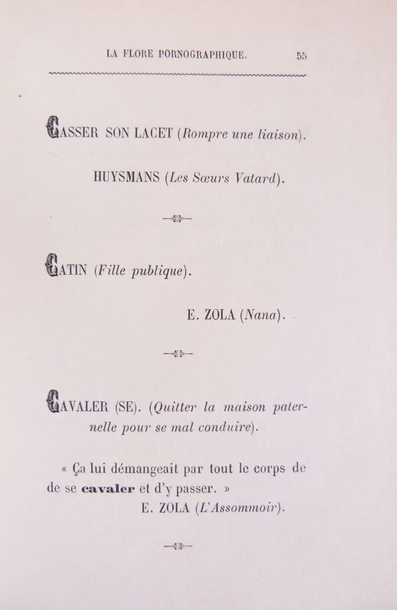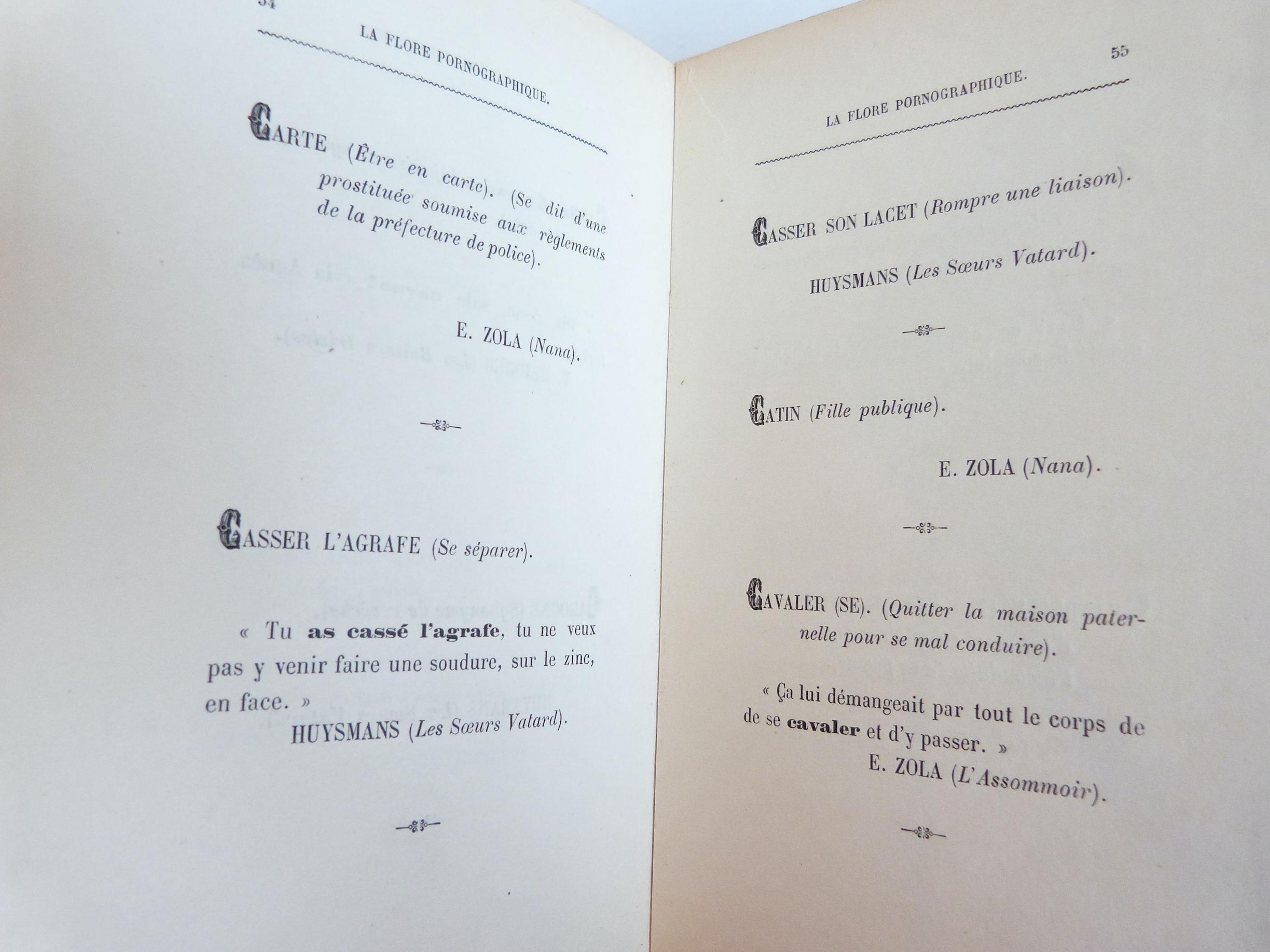 ÉDITION ORIGINALE publiée sous le pseudonyme d’Ambroise Macrobe. L’auteur relève et traduit les expressions imagées ou argotiques relatives à l’amour utilisées par les auteurs naturalistes, en particulier Maupassant, Zola et Huysmans.