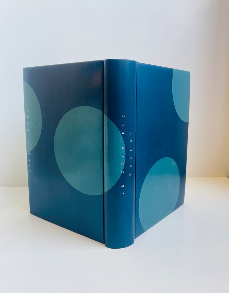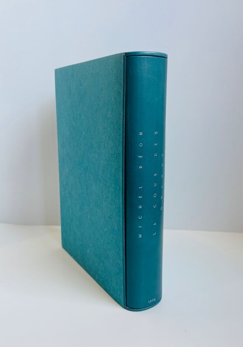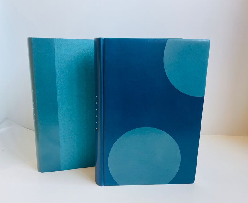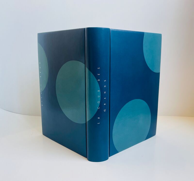 Sous étui bordé et sous chemise en demi-box turquoise, papier Japon assorti, doublée d'agneau velours bleu outremer. Reliure bradel à plats rapportés plein box océan, orné sur le premier plat de deux larges cercles de box turquoise, partiellement découpés, aux bords des tranches, demi-cercle de box identique en bordure sur le second plat et cercle complet empiétant sur le dos. Dos lisse, titre en long au palladium sur le second plat et le dos. Doublures et gardes volantes de papier Japon bleu turquoise clair. Couverture et dos conservés. Reliure signée H. LIESEN.