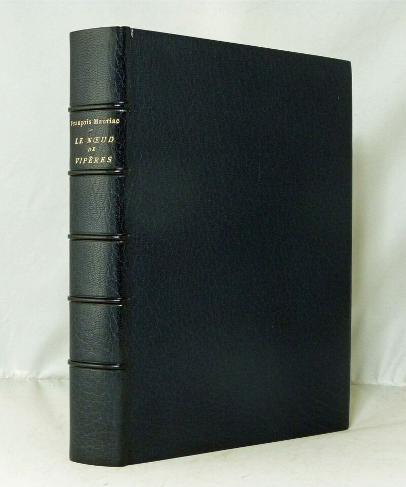 Sous étui bordé et chemise en demi-maroquin bleu nuit. Reliure plein maroquin bleu nuit. Dos à 5 nerfs. Contre plats doublés de plein box gris. Toutes tranches dorées. Couverture et dos conservés. Reliure signée J.P. MIGUET.
