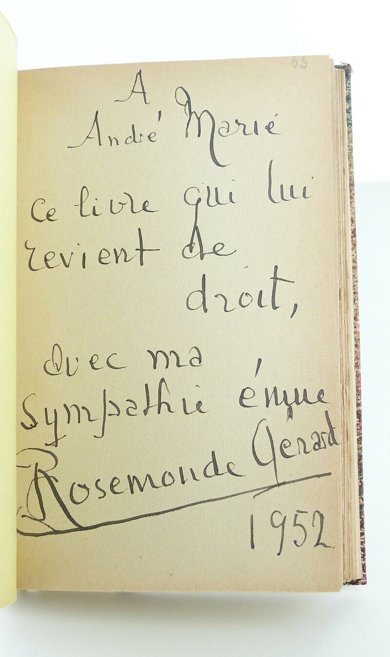 ÉDITION ORIGINALE de cette biographie de son époux. Exemplaire du tirage courant enrichi d'un très bel envoi de Rosemonde Rostand-Gérard à André Marie, l'ancien ministre de L'instruction publique qui inaugurait à Cambo-les-Bains, cette même année 1952, un monument en hommage à Edmond Rostand :