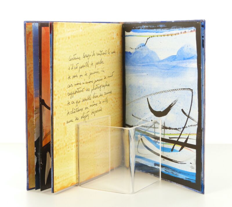 ÉDITION ORIGINALE MANUSCRITE produite à 10 exemplaires écrits à la main par l’auteur (10 pages), ornée de peintures originales à l’aquarelle par Julius Baltazar (10 pages dont quatre à double page reliure comprise). Exemplaires IX / X signé par l’auteur, par l’artiste et par le relieur Renaud Vernier.