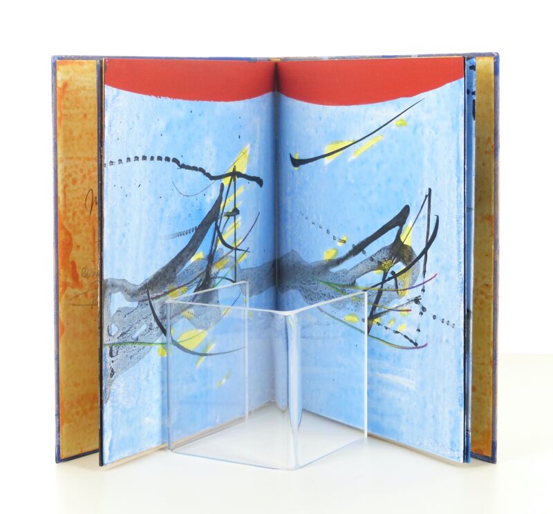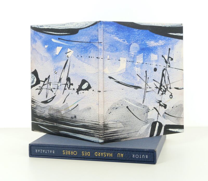 Plaquette petit in-12 carré (150 x 130 mm) de [12] ff. le premier et le dernier fixés en contreplats de la reliure. Sous étui et chemise à dos de maroquin bleu nuit doublée de daim beige. Reliure souple de maroquin clair entièrement peinte à l’aquarelle par Julius Baltazar, dos lisse muet, non rogné.