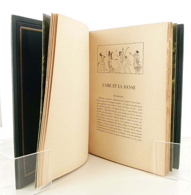 Reliure plein chagrin vert bouteille, carré de veau blond sur le premier plat avec le titre en cuir. Tête dorée. Encadrement intérieur et moirée vert. Couverture et dos conservés.