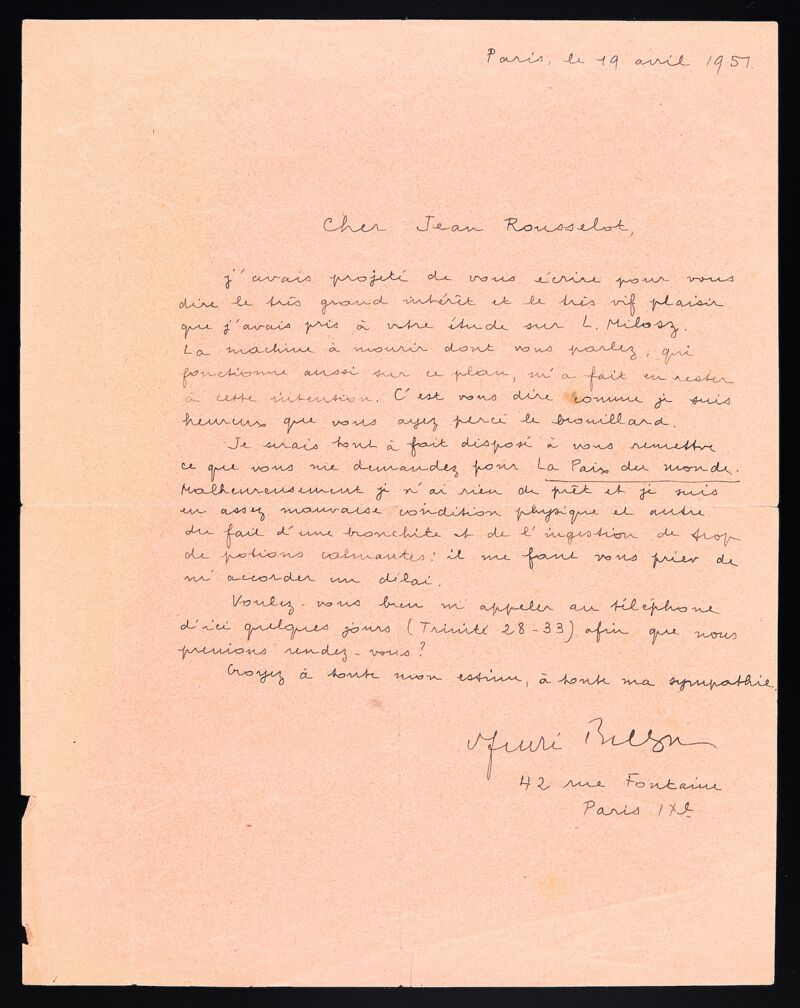 "J'avais projeté de vous écrire pour vous dire le très grand intérêt et le très vif plaisir que j'avais pris à votre étude sur L. Milosz. La machine à mourir, qui fonctionne aussi sur ce plan, m'a fait en rester à cette intention. C'est vous dire combien je suis heureux que vous ayez percé le brouillard."