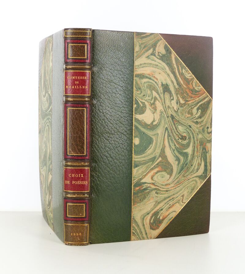 Reliure demi-maroquin vert à coins, dos orné et mosaïqué de maroquin rouge à 4 nerfs. Tranche supérieure dorée sur témoins. Couvertures et dos conservés. Reliure signée Yseux, succ. de Thierry-Simier. A grands témoins.