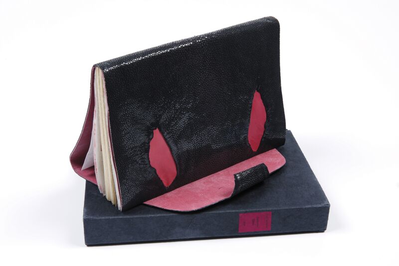 Sous coffret noir. Reliure souple d'Annie ROBINE d'une sobriété extrême avec une peau de galu- chat grise, s'ouvrant sur un daim de porc rose pâle. Édition collective des recueils Amies, Femmes et Hombres. Chaque poème est orné d'une lettrine historiée gravée sur bois assez libre et de quelques culs-de-lampe érotiques également gravés sur bois (anonymes).