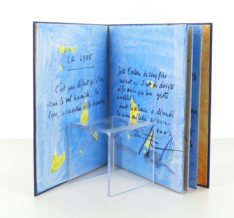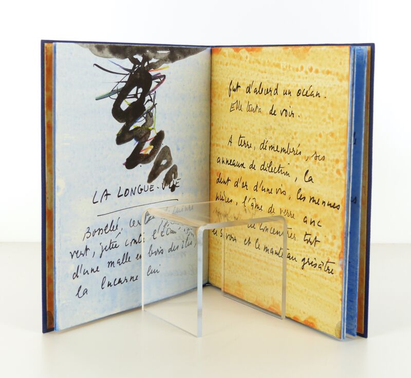Sous étui et sous chemise avec dos de maroquin noir doublée. Reliure plein maroquin bleu souple. Sur le premier plat étiquette de peau avec titre et ornementation aquarellée à la main par Baltazar, dos lisse muet. Reliure signée Renaud VERNIER-1995.