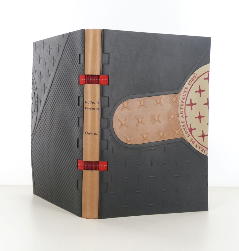 Reliure révorim ornée sur le premier plat d’une grande étiquette circulaire mosaïquée en box beige et portant un semis de croix ainsi que la mention Jean de Gonet Artefacts, 1989 poussés en rouge foncé. Dos de basane ocre. Couverture et dos conservés. Reliure signée et numérotés par J. de Gonet.