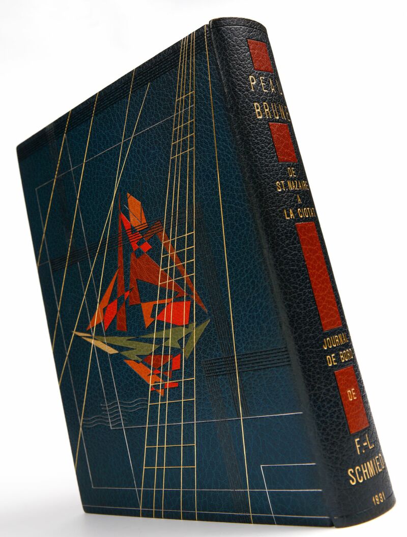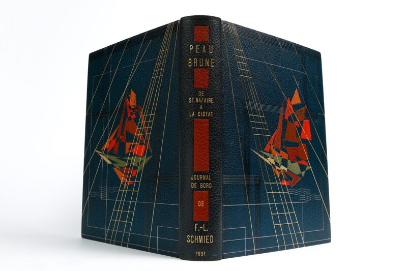 Sous étui bordé et sous chemise en demi-maroquin. Reliure plein maroquin bleu. Plats ornés d'un voilier mosaïqué de maroquin brun, rouge, brique, vert, beige avec filets rayonnants dorés et jeu de filets à froid, doublures et gardes de tissu bleu bordé de maroquin ocre. Toutes tranches dorées. Couverture rempliée, au titre imprimé en relief, conservée. Reliure signée DEVAUCHELLE Rel-Dor.