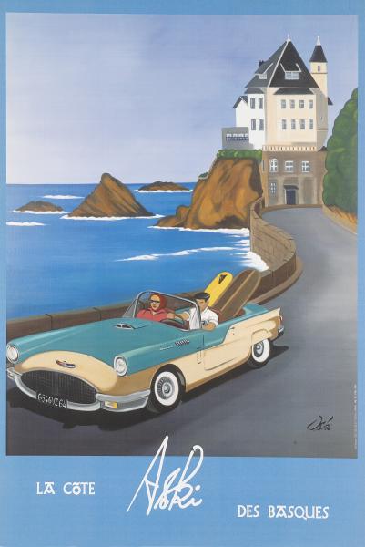 Réunion de 7 affiches modernes en couleurs illustrées par ASKI. Maison de l'Infante (Saint-Jean-de-Luz), Toros (x2), San Fermin feria del toro (Pamplona - Iruña), Partie de mus, Déjeuner sur l'herbe à Itxassou, Partie de pelote à Sarre, La côte des Basques, Guetaria, Elantxobe (x2).