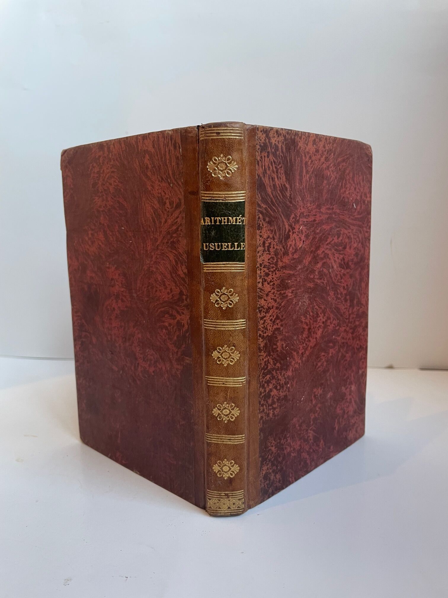Contenant environ 500 exercices et en outre 350 problèmes très variés sur les règles de Trois, d'intérêt, d'Escompte, etc., résolus sans le secours des proportions par une méthode facile et propre à former le jugement.Reliure demi-basane marron. Dos lisse finement orné et pièce de titre verte. Mors légèrement fendu mais sans fragilité. Tranches de couleur jaune. Intérieur très frais.