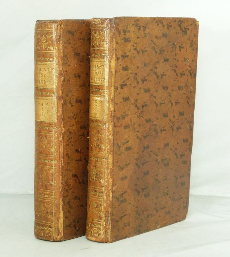 Reliure d'époque pleine basane marbrée. Dos lisse orné. Tranches marbrées. Petites fentes aux mors, coins frottés, quelques rousseurs, tâches et réparations au tome 1. L'édition est ornée d'un portrait du capitaine Wilson gravé par Sophie Massard d'après Russell, d'une carte dépliante des îles Pelew, et de 15 planches, dont 12 dépliantes, gravées en taille-douce notamment par De Gouy, Pierre François Tardieu, Miss Kent d'après Devis ou encore S. Jouan.