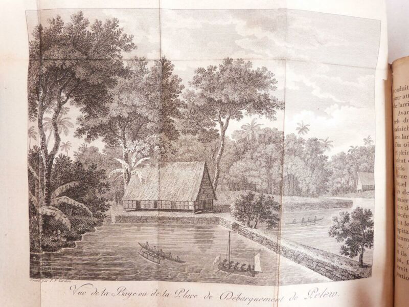 Édition originale de la traduction française de cette relation composée par l'écrivain et poète George Keate (1729-1797) à partir des journaux et des communications de Henry Wilson, capitaine de l'Antelope qui fit naufrage en août 1783 sur un récif près de Koror. Elle parut la même année que l'originale anglaise.